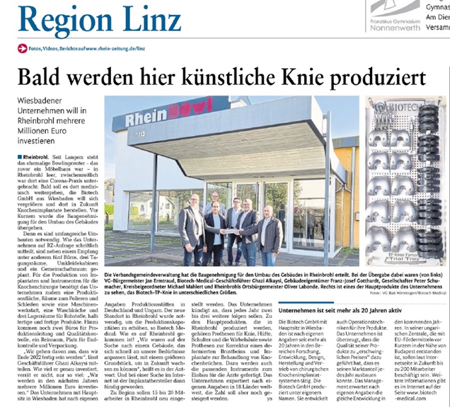 We assume that we will be ready by the end of 2022. The new location in Rheinbrohl was necessary to increase the production capacities At the beginning, we would initially like to employ 15-20 new employees in Rheinbrohl. The main products manufactured in Rheinbrohl include prostheses for the knee, hip, shoulder and spine, as well as prostheses for correcting a deformed sternum and implants for treating bone fractures. In addition, the appropriate instruments for installation for the doctors are manufactured.