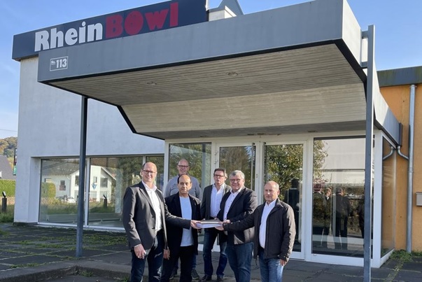 Present at the handover of the building permit were (from left) VG Mayor Jan Ermtraud, Biotech GmbH Managing Director Dr. Ghazi Alkaysi, building owner Franz-Josef Gotthardt, partner Peter Schumacher, district member Michael Mahlert and Rheinbrohl’s local mayor Oliver Labonde.
